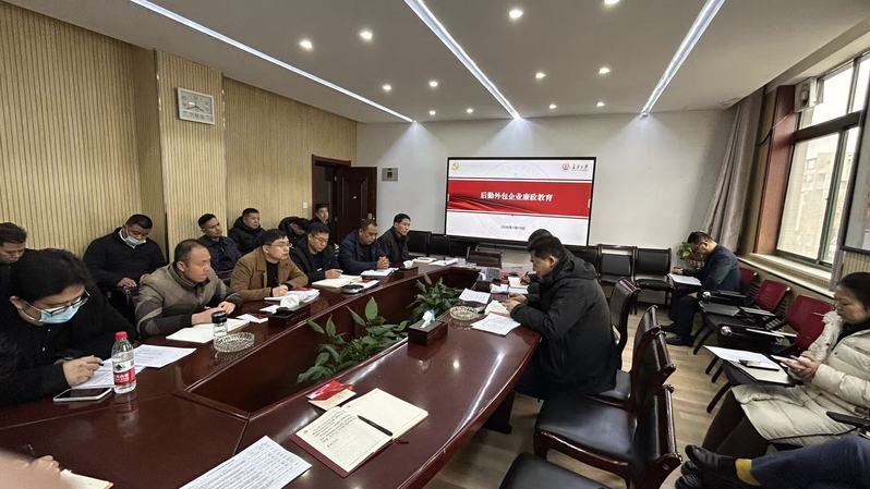 田运涛从五个方面对各服务企业开展廉洁教育。一是坚守服务初心,以高质量服务筑牢合作根基;二是严守廉洁底线,以健全防控体系防范廉政风险;三是强化人员管理,以规范队伍建设提升服务效能;四是筑牢舆情防线,以主动应对处置维护校园稳定;五是警惕“围猎”陷阱,以清醒认知守住廉洁底线。