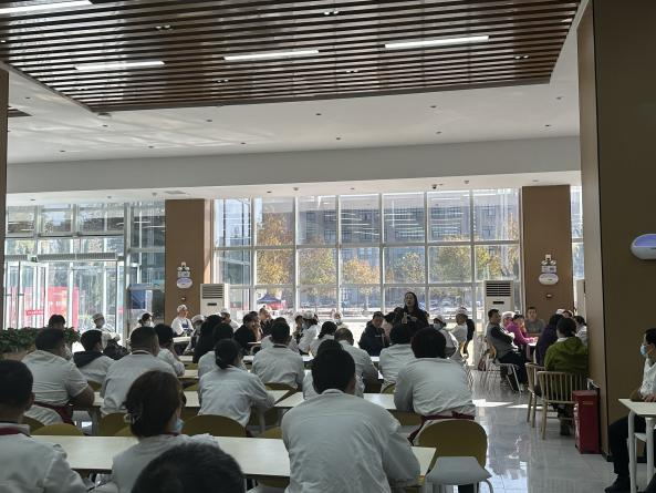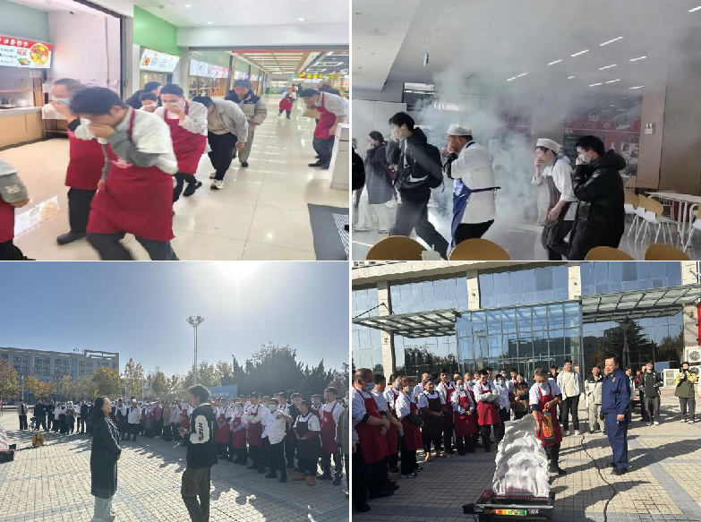 培训结合食堂工作实际,围绕校园食堂消防安全防范重点演练,系统讲解了消防器材使用、初起火灾扑救及火场逃生要点等内容。随后开展的实战演练模拟食堂突发火情:员工发现火情后立即大声呼救并上报,消控室确认后启动手动火灾报警按钮,随即触发声光报警系统与消防应急广播系统,实现了“一楼报警,全楼响应”的联动机制。在警报声中,参训人员迅速行动,关闭气源电源,捂住口鼻低姿前行,有序快速完成紧急疏散。全体人员安全撤离至滋兰苑南广场集结点后,迅速完成了人员清点与上报工作。